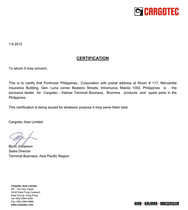 Armen Manlapat, SBITC Terminal Manager receives from Aristheo Ramos, Portmizer Phils. Sales Director, the Acceptance Certificate for one brand new Kalmar DRF450-60S5M reachstacker.